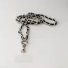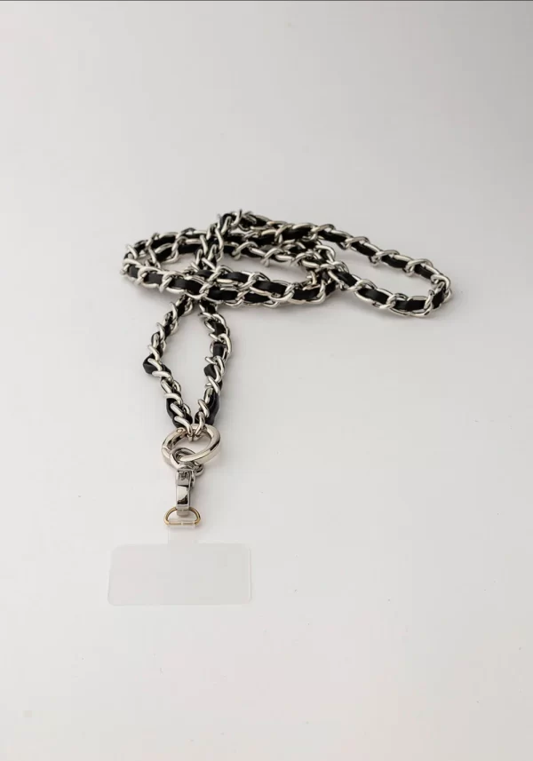 Crossbody iPhone-band met een zilveren ketting om een grijze pu.