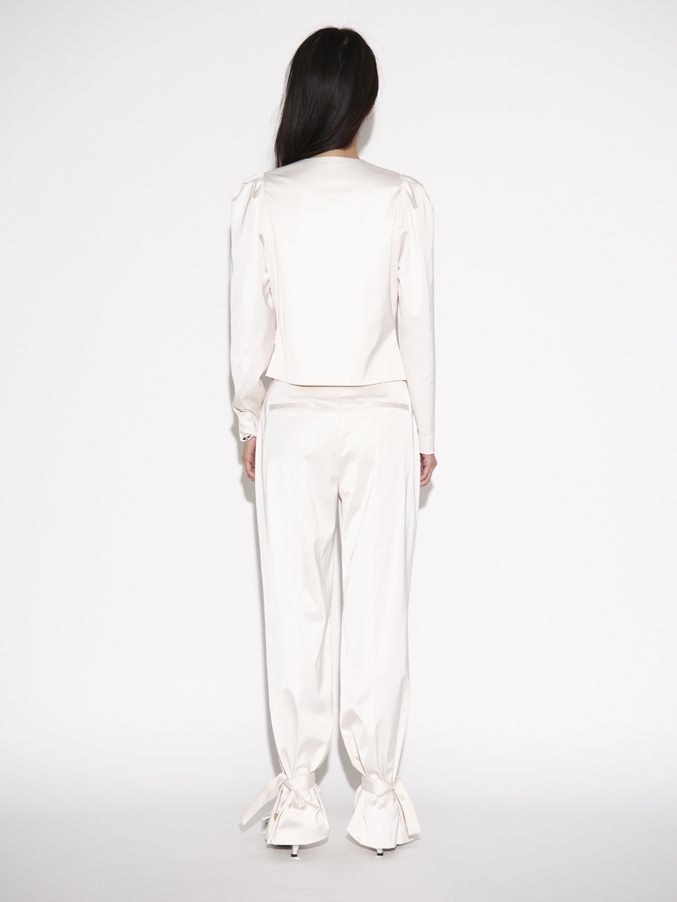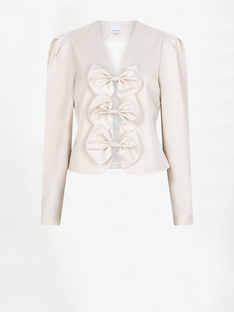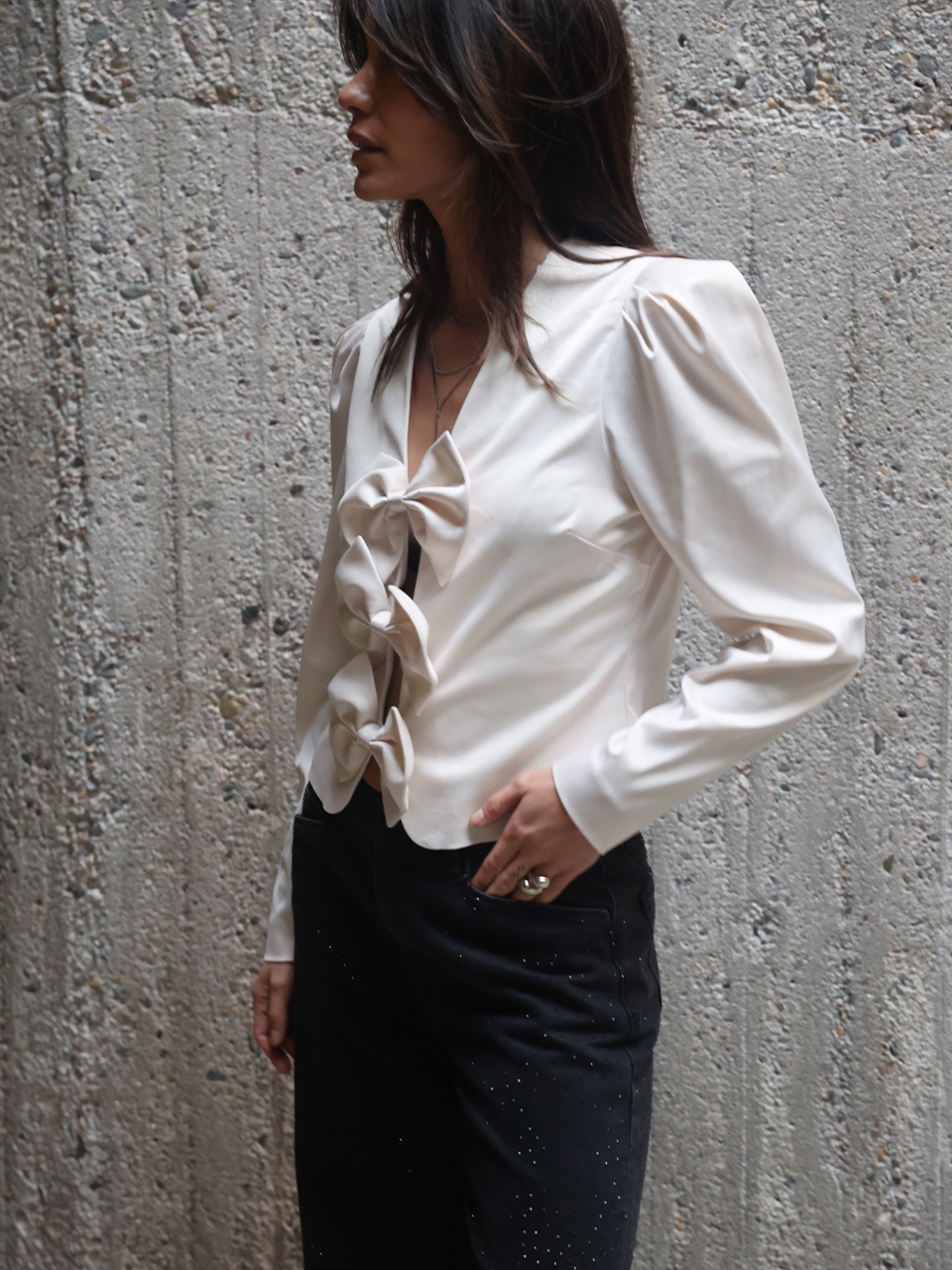 Maak je klaar voor het feestseizoen met de Soralla top in crèmekleur of zwart. Gemaakt van gerecycled satijn, met geplooide schouders en drie decoratieve strikken aan de voorkant voor een vrouwelijke statement look. Draag met de bijpassende Harron broek en de Shay pumps in zilver voor een totale DANTE6-look.