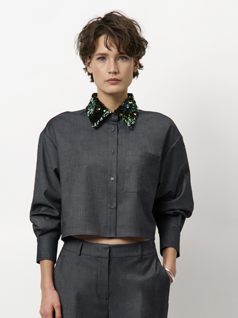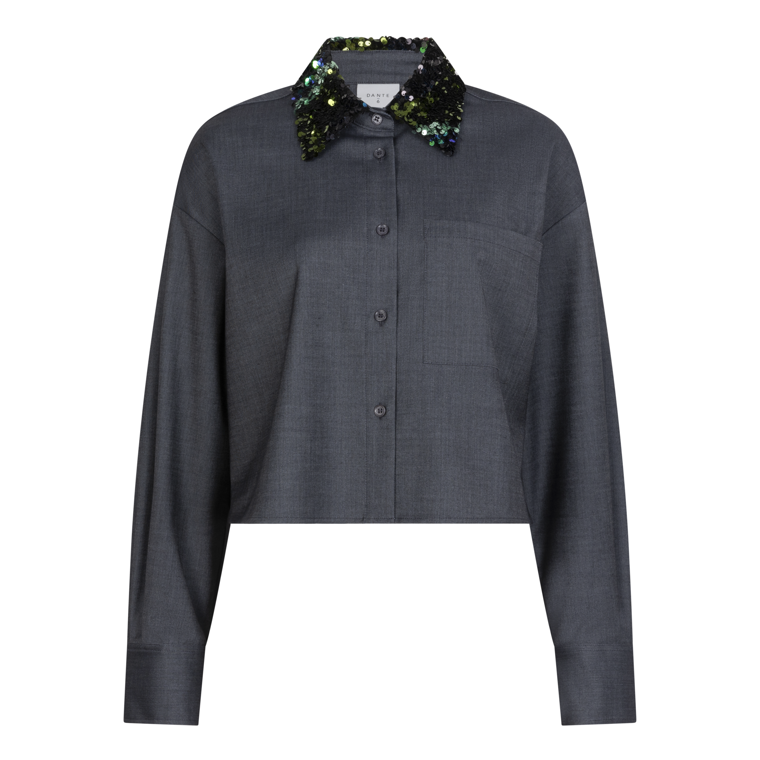 • Puntkraag met pailletten en knoopsluiting aan de voorkant