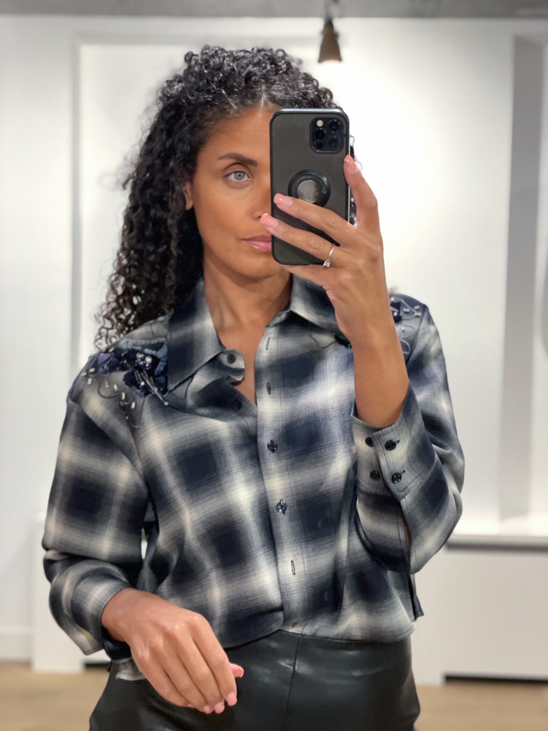 Voeg een vleugje glam-grunge toe aan je garderobe met onze Eason blouse in Nocturnal Blue. Deze cropped blouse is gemaakt van geruite flanel en heeft lange mouwen en een klassieke overhemdkraag. De glamoureuze touch zit ’m in de decoratieve schouderapplicaties, waardoor dit item gegarandeerd opvalt in de menigte. Draag met de bijpassende geruite Krissy rok voor een echte casual-chique look — helemaal in Dante6 stijl.