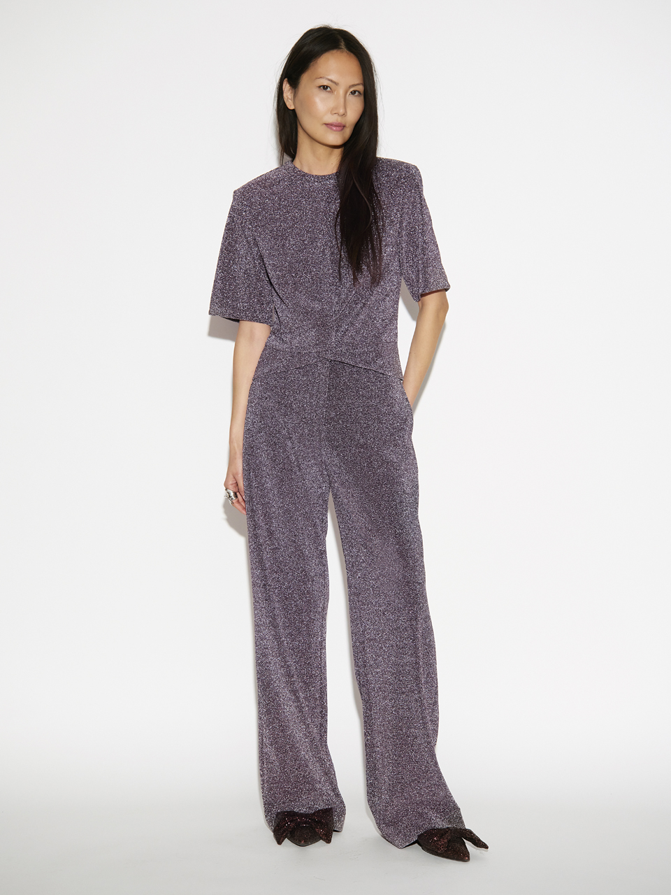 De Fantina top in Amethyst is de perfecte combinatie van glamour en comfort. Gemaakt van zachte lurex jersey met stretch, een hoge halslijn en een speelse twist aan de voorkant. De afneembare schoudervullingen geven de top een krachtige uitstraling. Draag met de Noemia broek of je favoriete jeans.