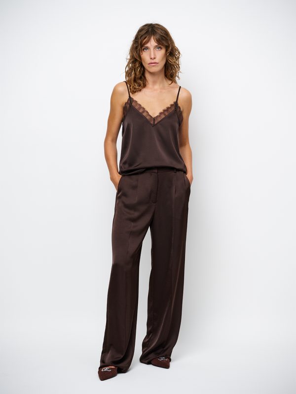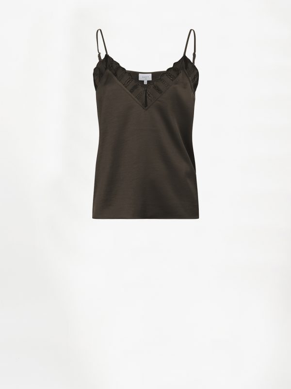 De Ipso kanten camisol top in Espresso Brown is een prachtige, veelzijdige must-have voor je garderobe. De top is gemaakt van gecertificeerd gerecycled satijn met fijne kantdetails langs de halslijn. De verstelbare spaghettibandjes en de heuplengte zorgen voor de perfecte balans tussen comfort en elegantie. De top is zowel chic als vrouwelijk dankzij de flatterende, losse pasvorm.
