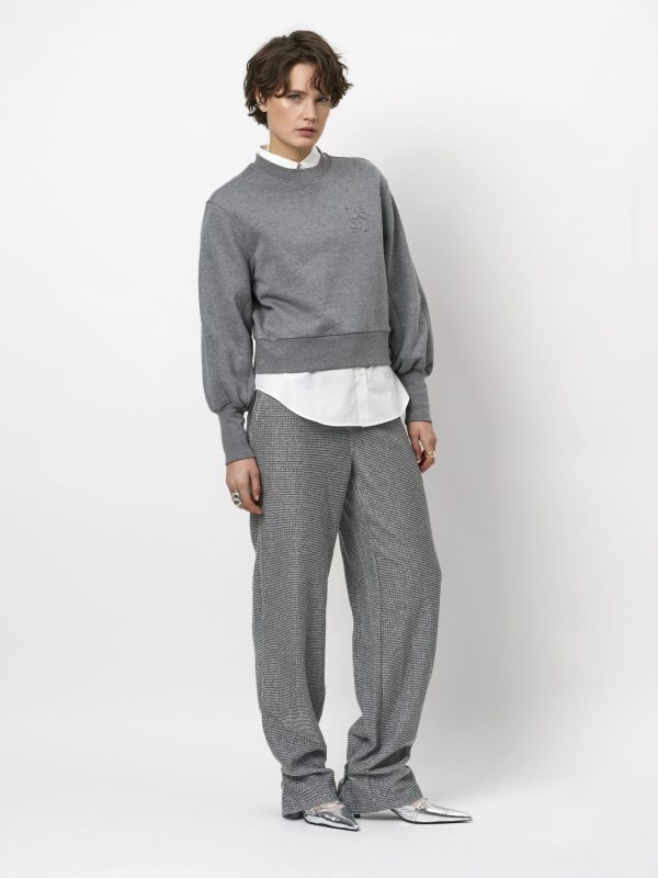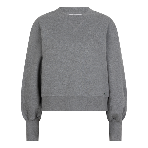 Geen garderobe is compleet zonder onze Lison trui in Granite Grey Mélange. Deze casual stijl is gemaakt van geborsteld, 100% biologisch katoen. De trui heeft een ronde hals en licht gepofte mouwen met lange boorden. Op de voorkant prijkt een embossed Dante6 logo. Draag er een blouse onder en combineer met onze zilveren Aremi pantalon voor een preppy look met een twist.