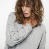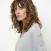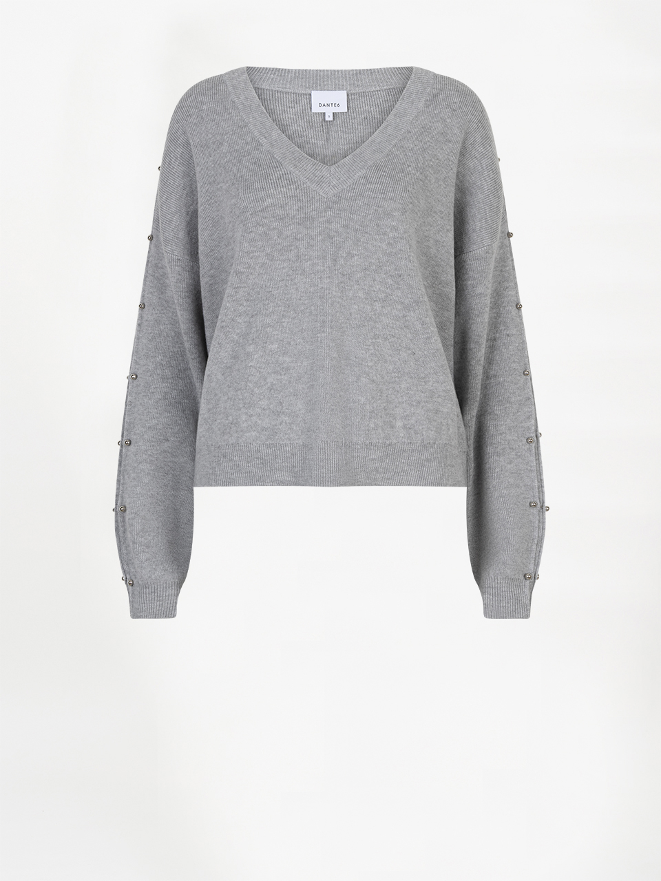 De Maxe trui in Heather Grey is gebreid van 100% gecertificeerde merinowol. De V-hals en relaxte pasvorm zorgen voor een moeiteloos silhouet. Langs de mouwen loopt een opvallend detail van metalen studs, geïnspireerd op piercing-accenten. Dit maakt de trui tot een eigentijdse statement knit die minimalisme en edge perfect combineert.