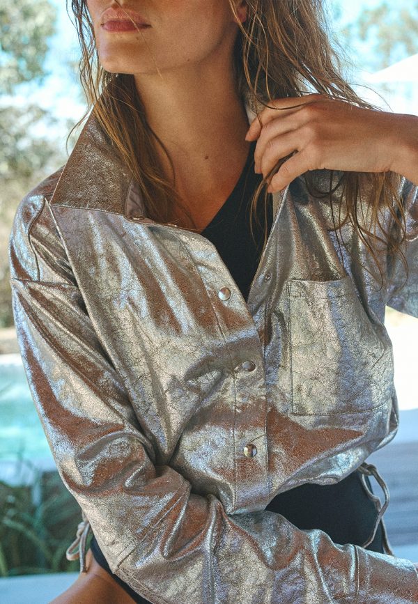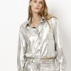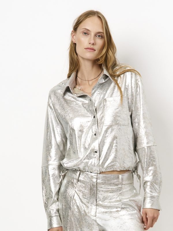Maak een statement met de Nikta blouse in metallic zilver. Dit unieke item, gemaakt van stretch faux suède met een opvallende crackle finish, voegt een speciale touch toe aan je garderobe. De cropped stijl met trekkoorden maakt deze blouse flexibel en eenvoudig te combineren. Draag het met de bijpassende Cheri broek voor een complete, gedurfde look.