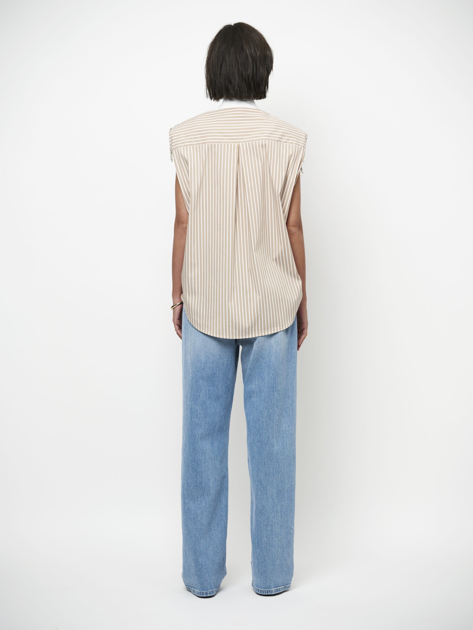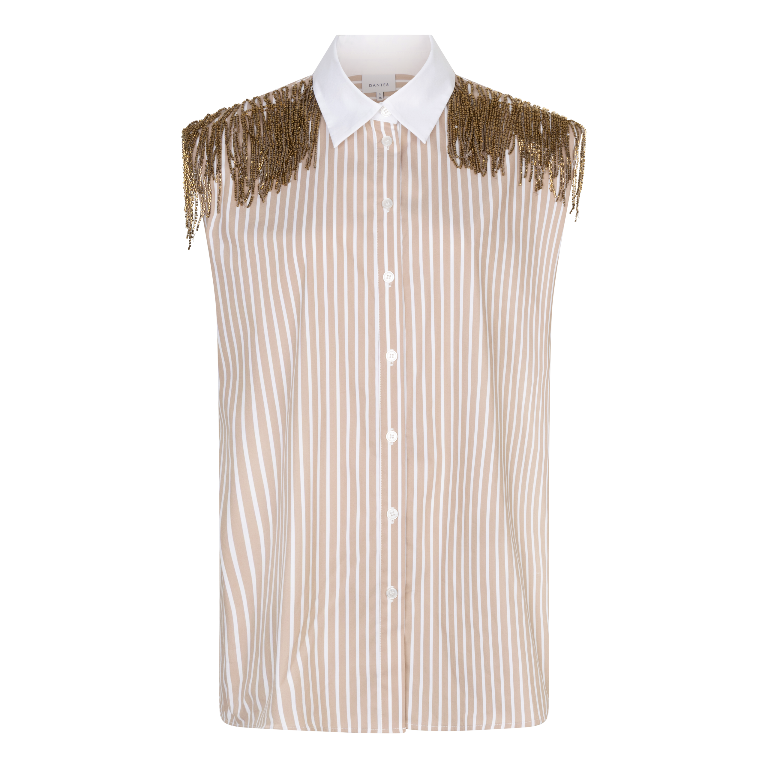 De Rhobin blouse in Sand Beige tilt je shirting game naar een hoger niveau. Gemaakt van een garengeverfde biologische katoenmix met subtiele pinstripe. De witte contrasterende kraag en knoopsluiting zorgen voor een klassieke touch, terwijl de kraalfranjes op de schouders het verschil maken. Afneembare schoudervullingen versterken het krachtige silhouet. Combineer met je favoriete DANTE6 jeans voor een opvallende day-to-night look.