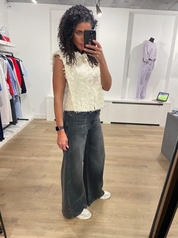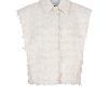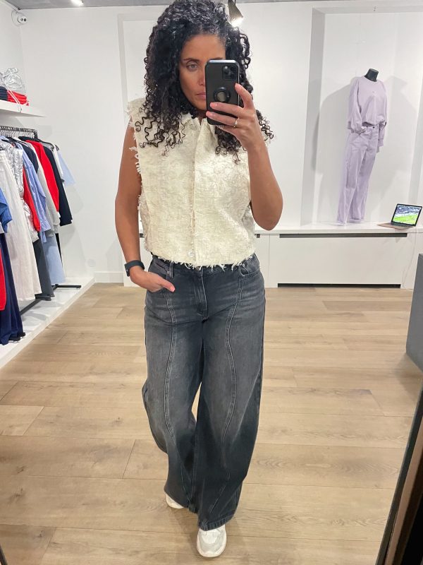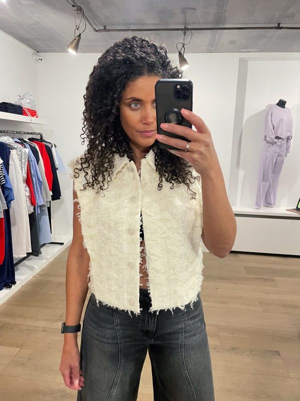 Breng speelsheid en textuur in je garderobe met ons Zoly gilet in Butter Cream. Dit item, gemaakt van jacquardstof met franjes, is perfect om te dragen als gilet over een andere top of op zichzelf. De subtiel geaccentueerde schouders en decoratieve zilveren knoop aan de voorkant geven het een unieke uitstraling waarmee je opvalt. Combineer het met de bijpassende Yubi shorts om de look compleet te maken.
