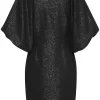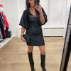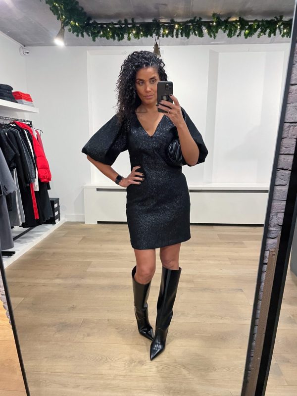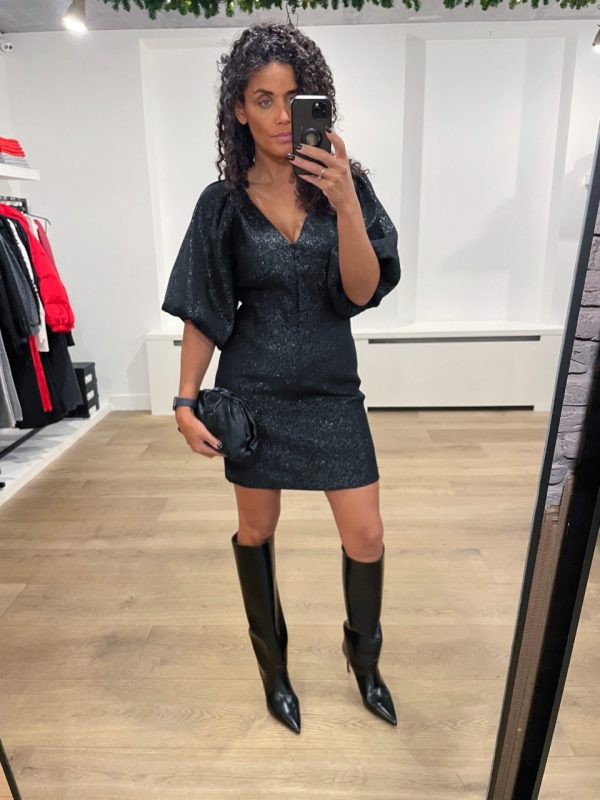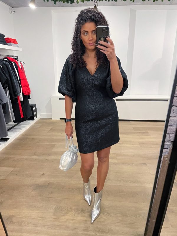 Deze elegante jurk heeft volumineuze pofmouwen en een flatterende V-hals, wat zorgt voor een verfijnde look. De glanzende stof voegt een vleugje glamour toe, perfect voor een avondje uit of speciale gelegenheden. Model is 176 cm lang en draagt maat M.